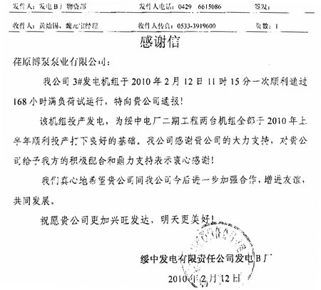 日前,綏中發(fā)電有限責(zé)任公司發(fā)電B廠發(fā)來感謝信,通報了我公司供貨的2000VZNM型立式循環(huán)水泵順利通過168小時滿負(fù)荷試運(yùn)行, 順利發(fā)電。綏中發(fā)電有限責(zé)任公司發(fā)電B廠,為2X1000MW超